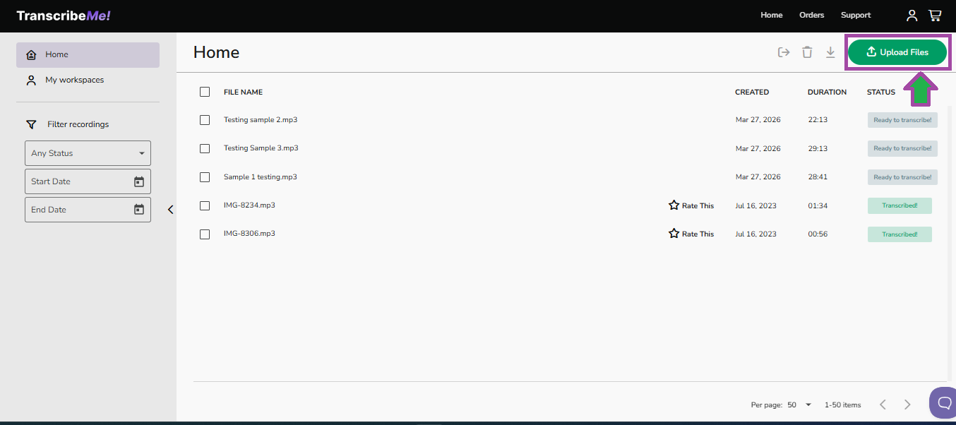 Once logged in, you will have to upload the files you wish to have transcribed, if you haven't used the Direct Order process. You will see a green 'Upload Files' button in the top right hand of your screen.