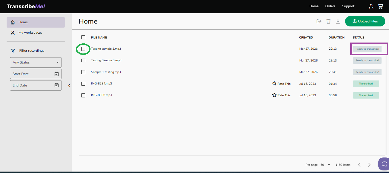 Once the file or files have finished uploading you will see a pop up window listing your files. This pop up window will have the title 'Ready to Transcribe,' at the top. If you have already uploaded files to your customer portal that you want to transcribe, you can get to this same point by clicking the box to the left of the file name of any file that has 'Ready to Transcribe' as it's status. When you click that box the green button at the top right hand of the page will turn from saying 'Upload Files' to saying Transcribe.