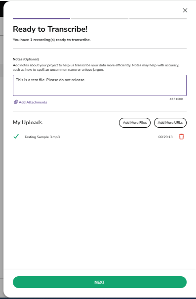 Once you click that Transcribe button it will open up the Ready to Transcribe! window referred to above. Please note there is a box here to place notes regarding context, unique spellings, etc.. However, in Automated Transcription the machine will not read the notes and anything you type in here will not affect the output. When ready, simply hit the green 'NEXT' button at the bottom of the window.
