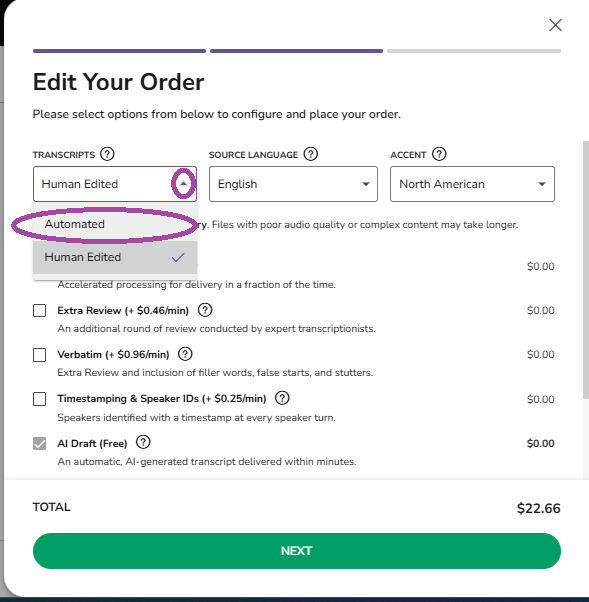 Once you hit 'NEXT' a new window pops up saying 'Edit Your Order'. This is where you can select Automated Transcription. By default the transcription type is automatically Human Edited. To change it to Automated Transcription hit the small down arrow so the drop down choices are visible and click on 'Automated Transcription'.