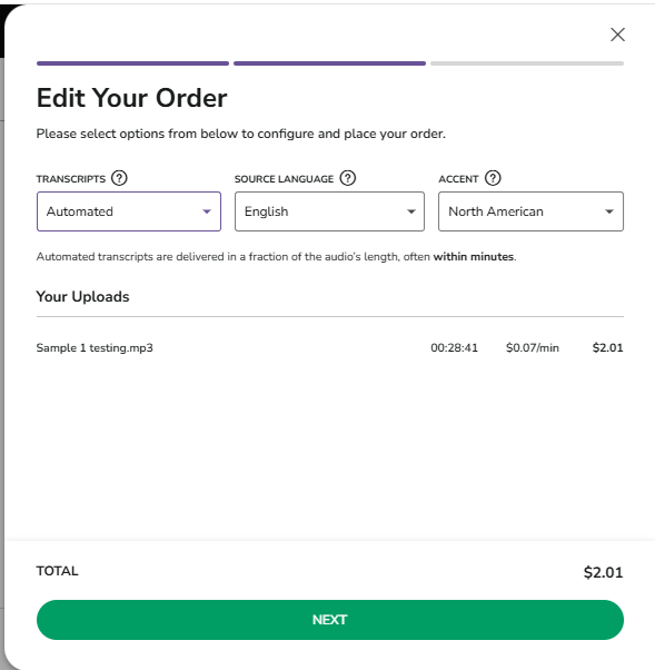 Once you select the 'Automated Transcription' option, the pricing automatically changes and the feature options disappear, allowing you to go straight to the placing of your order. Please be aware that Timestamping is automatic at every 30 seconds, and speaker IDs are not available in Automated Transcription. Also, please ensure that you have selected the correct source language of your audio. We are unable to refund for files that receive only an inaudible transcript because the incorrect language was selected on ordering. You can now hit the green 'NEXT' button to proceed.
