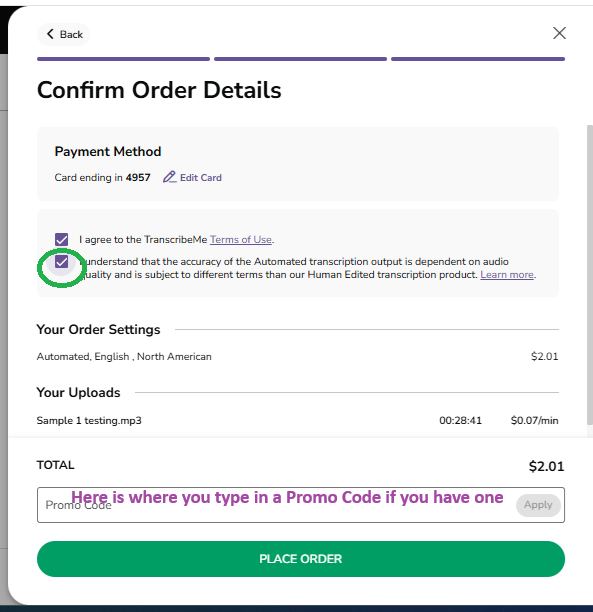 A window will pop up that says 'Confirm Order Details'. On this screen you will be asked to add your credit card, and to agree to the terms of Service. You will also be asked to check the box that says you are aware that the accuracy in Automated Transcription is dependent on the quality of the audio. Until you click this box you can not move forward with your order. You can also enter any promo code you might have. Once this is done the button on the bottom turns green and you can Place Order.