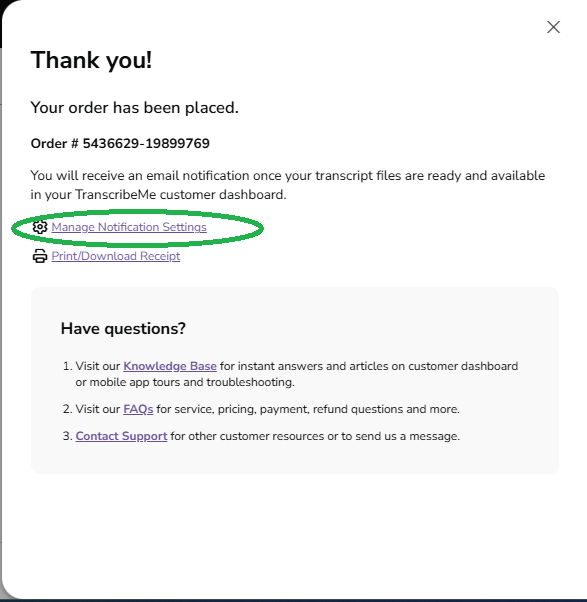 Your Order is now placed and you will receive an email notification upon completion. If you wish to have your transcript attached to your email notification you can select that option by clicking on the Manage Notification Settings linked on the confirmation screen. Also on this screen is the ability to download or print a receipt, your order number, and quick links for our Knowledge Base, FAQ's and Support. You can also download a copy of your transcript via your account once completed.