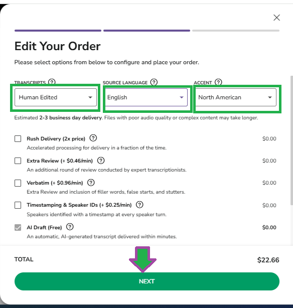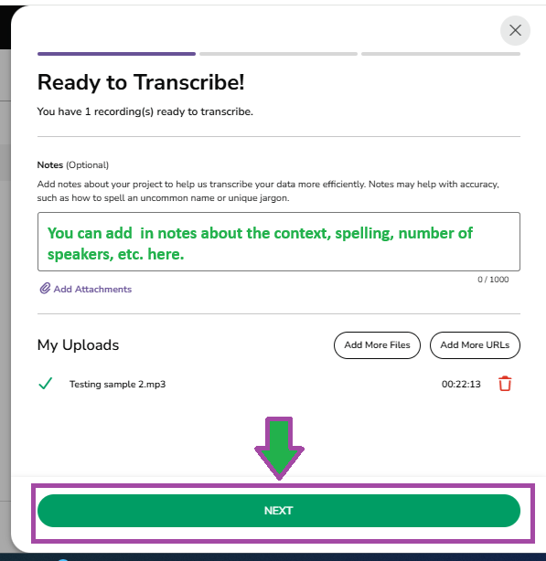 A pop up window will appear saying Ready to Transcribe! This will show the files you currently have selected and allowing you to upload any additional files you need. It will also allow you to enter any notes you feel would help in the transcription. These notes are meant for context and unfamiliar words. Special formatting instructions will not be followed if notes are entered at this point. Once you have all the files you need, click the green NEXT button.at the bottom of the screen.