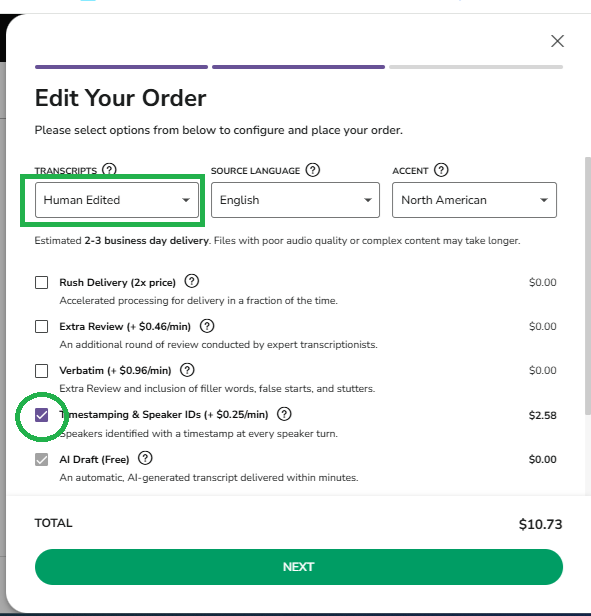 *Please note: Do not change the Turnaround time, as First Draft files are usually completed within 24 hours, if you change the turnaround time to 1 Business day by clicking the RUSH feature you are not going to get your transcript any faster, but you will be charged double the price, as 1 Business Day is our RUSH service and it doubles the reguar rate.